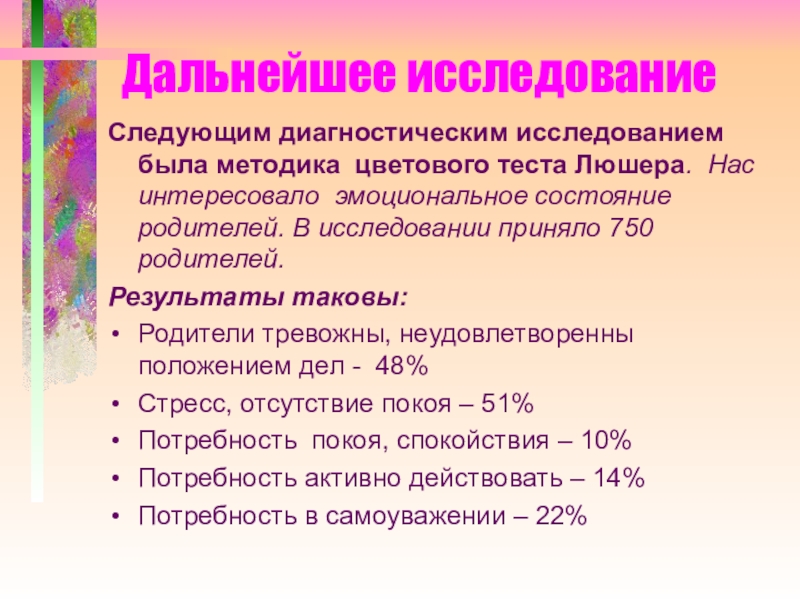 Следующим диагностическим исследованием была методика цветового теста Люшера. Нас интересовало
