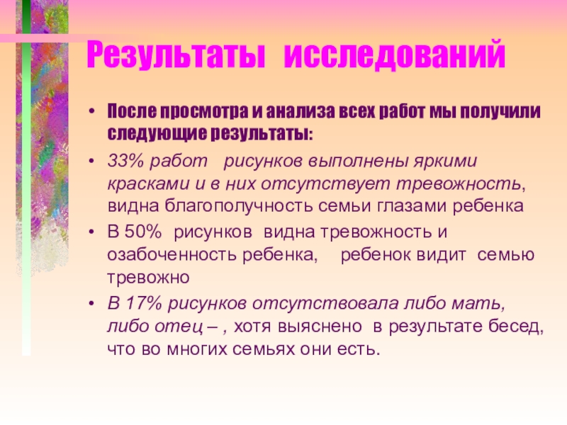 В 17% рисунков отсутствовала либо мать, либо отец – , хотя выяснено в результате бесед, что во многих семьях они есть.