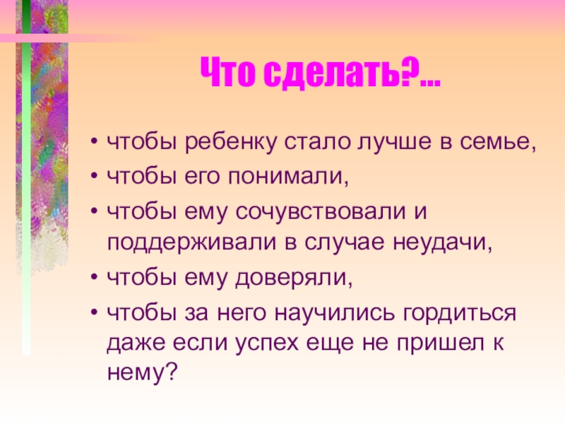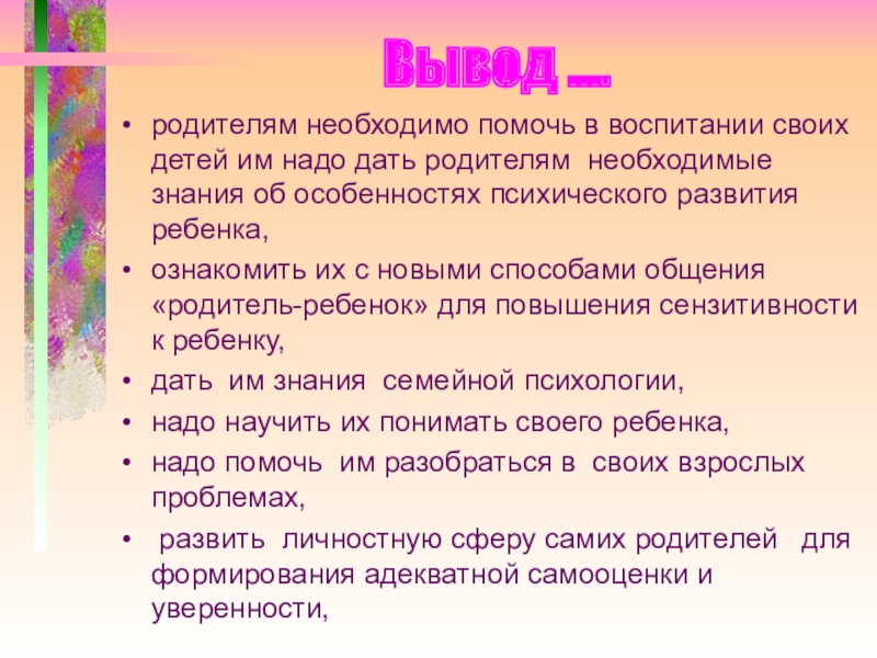развить личностную сферу самих родителей для формирования адекватной самооценки и уверенности,