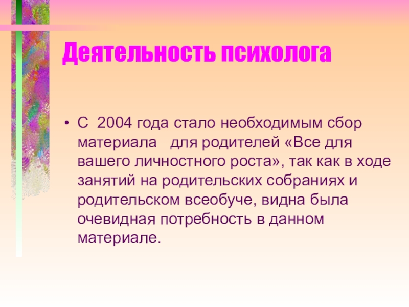 «Все для вашего личностного роста», так как в ходе занятий на родительских собраниях и родительском всеобуче, видна была очевидная потребность в данном материале.