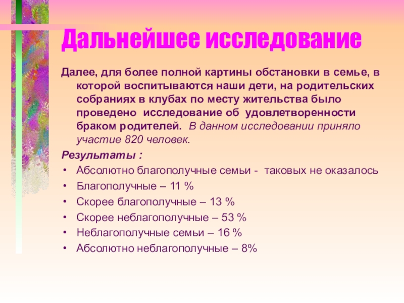 воспитываются наши дети, на родительских собраниях в клубах по месту жительства было проведено исследование об удовлетворенности браком родителей. В данном исследовании приняло участие 820 человек.