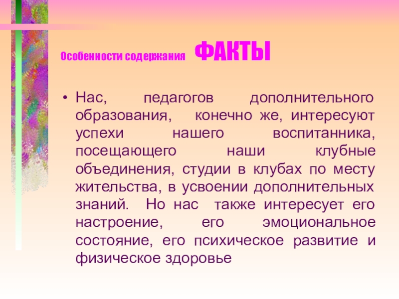 нашего воспитанника, посещающего наши клубные объединения, студии в клубах по месту жительства, в усвоении дополнительных знаний. Но нас также интересует его настроение, его эмоциональное состояние, его психическое развитие и физическое здоровье