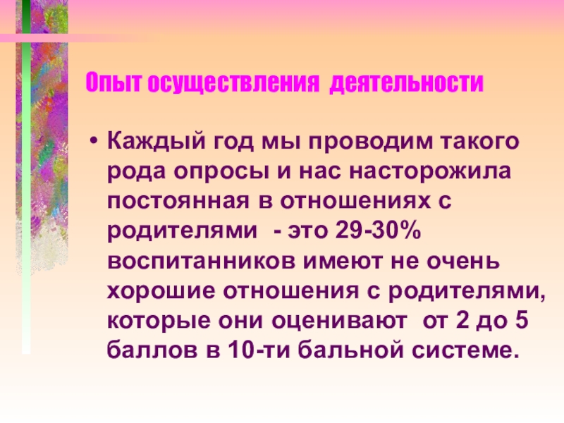 насторожила постоянная в отношениях с родителями - это 29-30% воспитанников имеют не очень хорошие отношения с родителями, которые они оценивают от 2 до 5 баллов в 10-ти бальной системе.