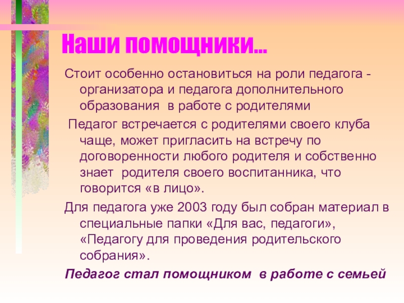 Для педагога уже 2003 году был собран материал в специальные папки «Для вас, педагоги», «Педагогу для проведения родительского собрания».