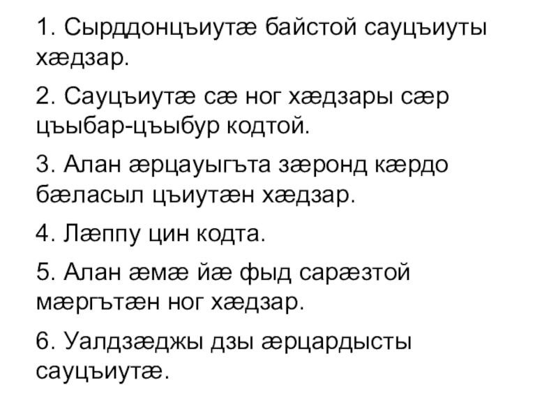 1. Сырддонцъиутæ байстой сауцъиуты хæдзар.2. Сауцъиутæ сæ ног хæдзары сæр цъыбар-цъыбур кодтой.3. Алан æрцауыгъта зæронд кæрдо бæласыл