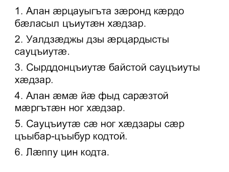 1. Алан æрцауыгъта зæронд кæрдо бæласыл цъиутæн хæдзар. 2. Уалдзæджы дзы æрцардысты сауцъиутæ. 3. Сырддонцъиутæ байстой сауцъиуты