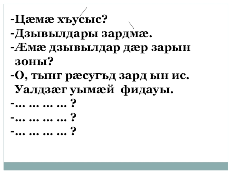 Цæмæ хъусыс?Дзывылдары зардмæ.Æмæ дзывылдар дæр зарын зоны?О, тынг рæсугъд зард ын ис. Уалдзæг уымæй фидауы.… … …