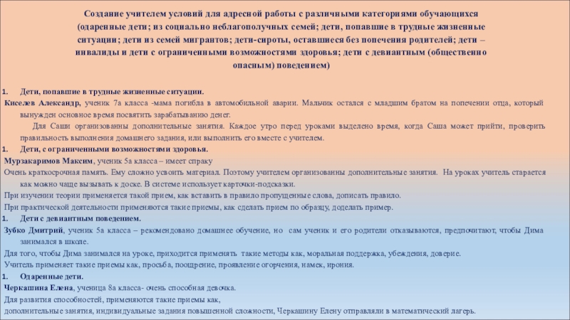 Киселев Александр, ученик 7а класса -мама погибла в автомобильной аварии. Мальчик остался с младшим братом на попечении отца, который вынужден основное время посвятить зарабатыванию денег.