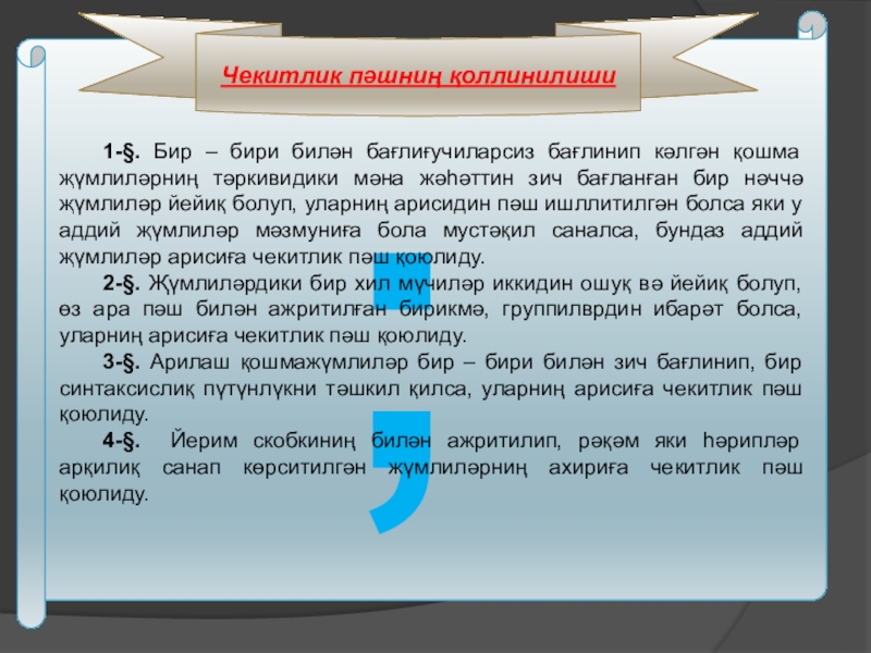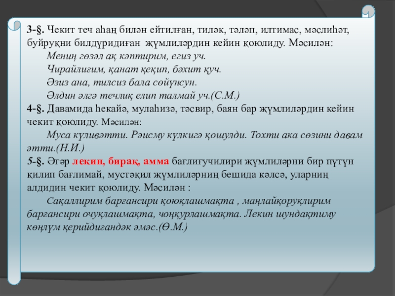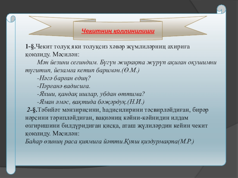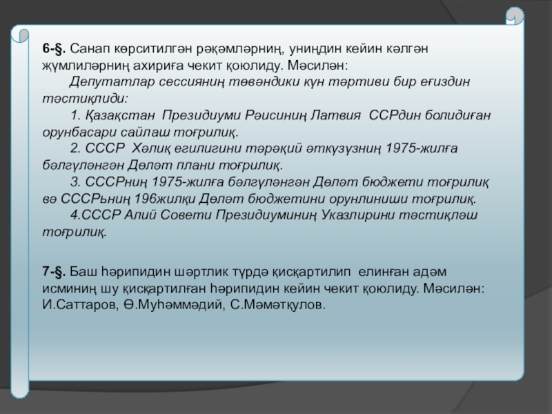7-§. Баш һәрипидин шәртлик түрдә қисқартилип елинған адәм исминиң шу қисқартилған һәрипидин кейин чекит қоюлиду. Мәсилән: