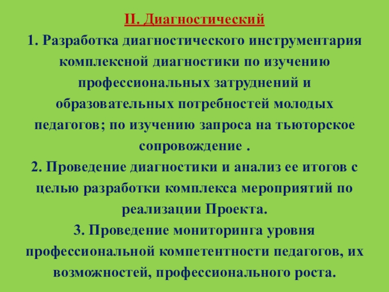 Слайд 9 II. Диагностический 1. Разработка диагностического инструментария комплексной диагностики по изучению профессиональных