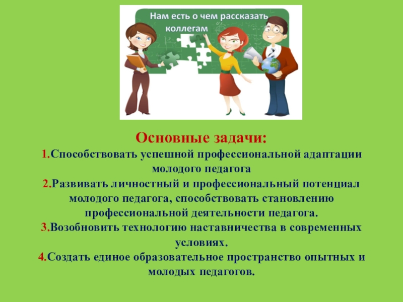 Слайд 4 Основные задачи: 1.Способствовать успешной профессиональной адаптации молодого педагога 2.Развивать личностный и профессиональный