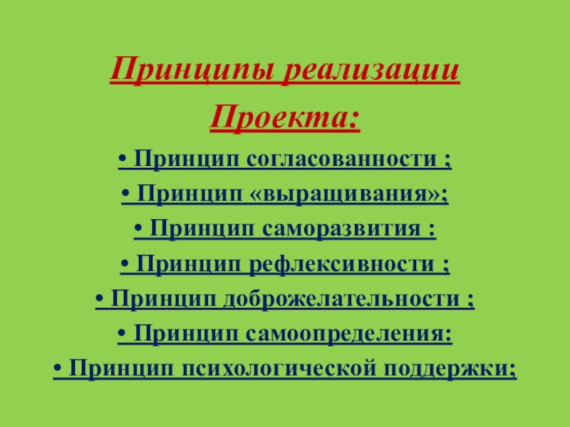 Слайд 5Принципы реализации Проекта: • Принцип согласованности ; • Принцип «выращивания»; • Принцип саморазвития : •