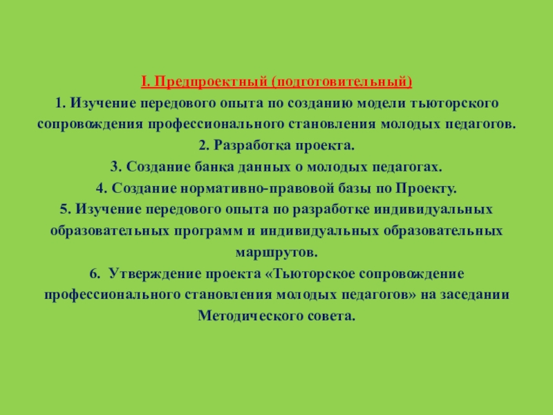 I. Предпроектный (подготовительный)  1. Изучение передового опыта по созданию модели тьюторского сопровождения профессионального становления молодых педагогов.