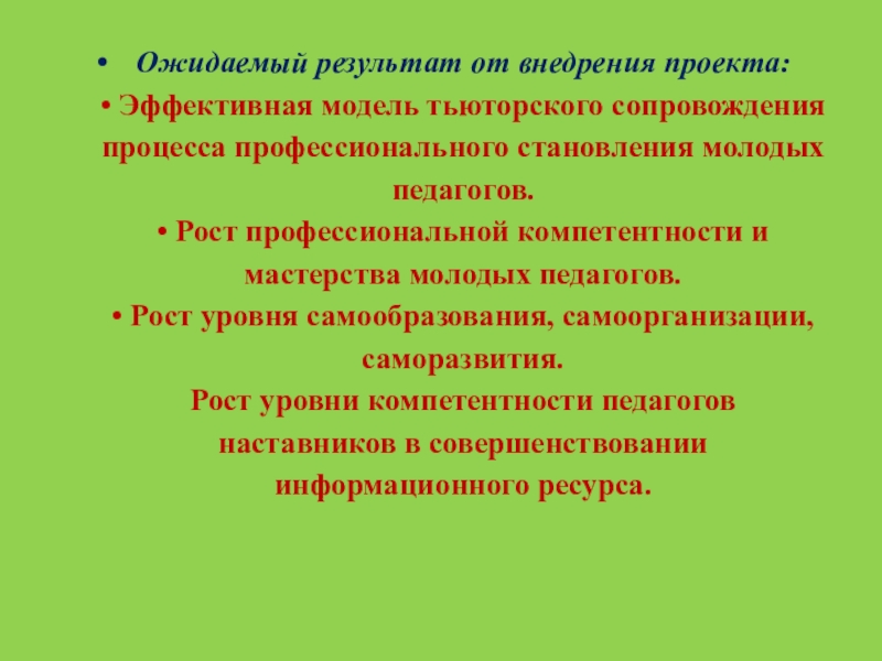 Ожидаемый результат от внедрения проекта: • Эффективная модель тьюторского сопровождения процесса профессионального становления молодых педагогов. • Рост