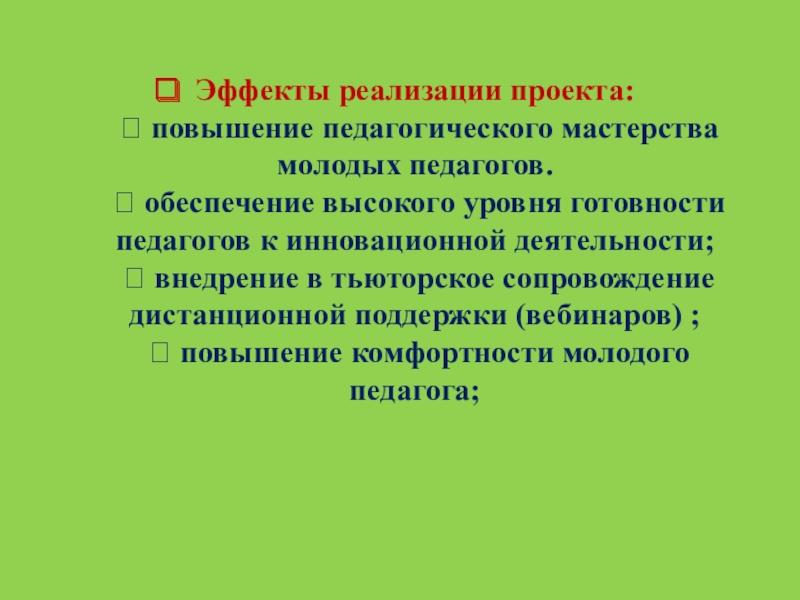 Эффекты реализации проекта:   повышение педагогического мастерства молодых педагогов.    обеспечение высокого уровня готовности
