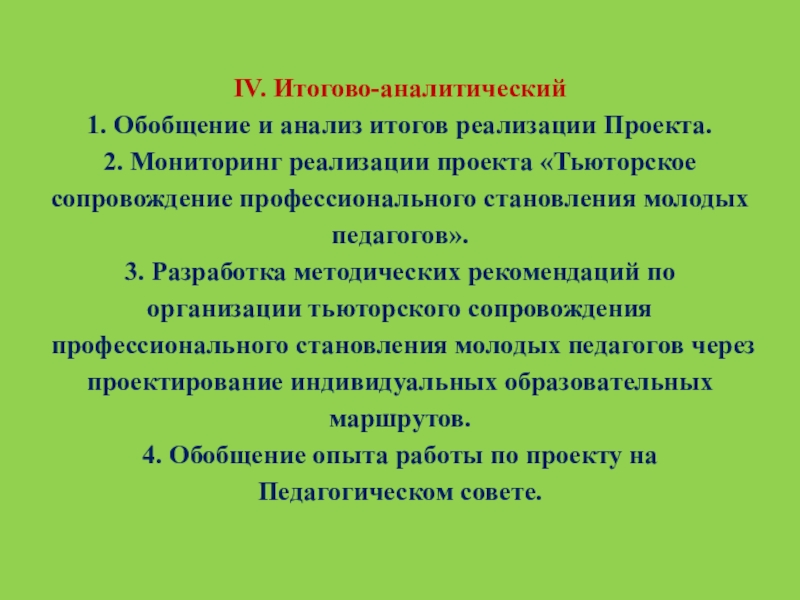 IV. Итогово-аналитический  1. Обобщение и анализ итогов реализации Проекта. 2. Мониторинг реализации проекта «Тьюторское сопровождение