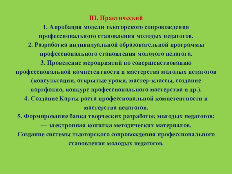 Слайд 10III. Практический 1. Апробация модели тьюторского сопровождения профессионального становления молодых педагогов. 2.