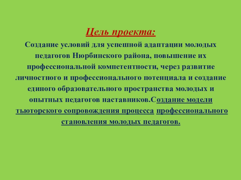 Цель проекта:  Создание условий для успешной адаптации молодых педагогов Нюрбинского района, повышение их профессиональной компетентности, через развитие