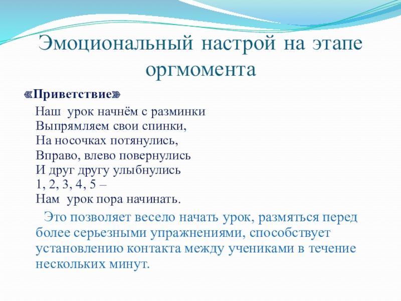 Выпрямляем свои спинки, На носочках потянулись, Вправо, влево повернулись И друг другу улыбнулись 1, 2, 3, 4, 5 – Нам урок пора начинать.