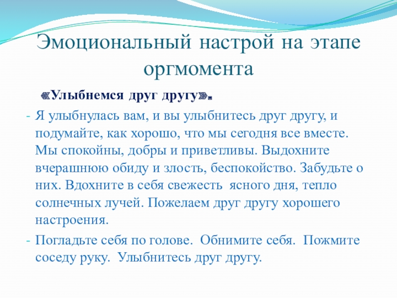 улыбнитесь друг другу, и подумайте, как хорошо, что мы сегодня все вместе. Мы спокойны, добры и приветливы. Выдохните вчерашнюю обиду и злость, беспокойство. Забудьте о них. Вдохните в себя свежесть ясного дня, тепло солнечных лучей. Пожелаем друг другу хорошего настроения.