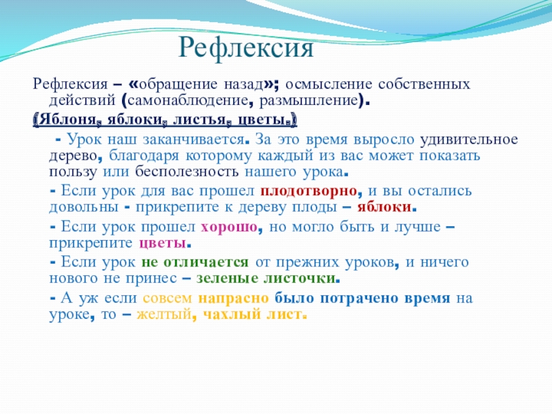 Рефлексия – «обращение назад»; осмысление собственных действий (самонаблюдение, размышление).