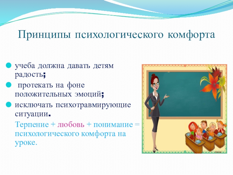 Терпение + любовь + понимание = психологического комфорта на уроке.