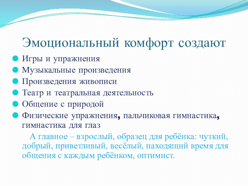 А главное – взрослый, образец для ребёнка: чуткий, добрый, приветливый, весёлый, находящий время для общения с каждым ребёнком, оптимист.