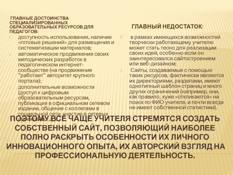 Главные достоинства специализированных образовательных ресурсов для педагогов: