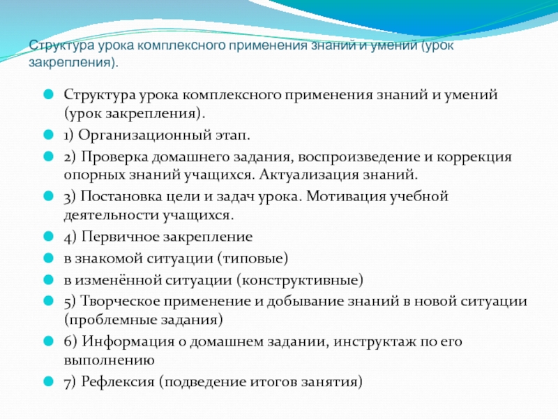 Структура урока комплексного применения знаний и умений (урок закрепления).Структура урока комплексного применения знаний и умений (урок закрепления).1)