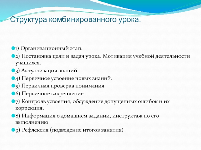 Структура комбинированного урока. 1) Организационный этап.2) Постановка цели и задач урока. Мотивация учебной