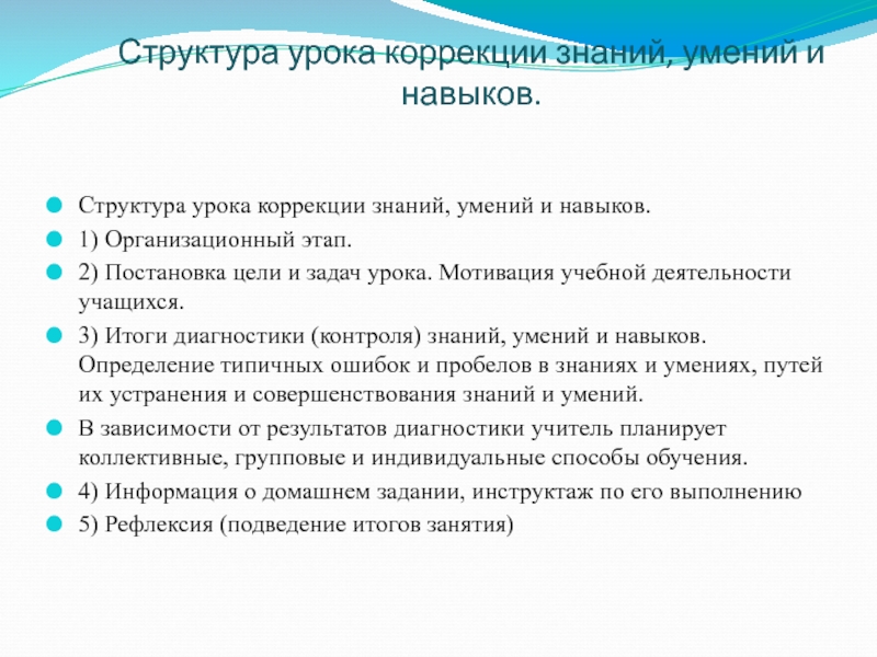Структура урока коррекции знаний, умений и навыков. Структура урока коррекции знаний, умений и навыков.1) Организационный этап.2) Постановка цели и задач урока. Мотивация учебной деятельности учащихся.3) Итоги диагностики (контроля) знаний, умений и навыков. Определение типичных ошибок и