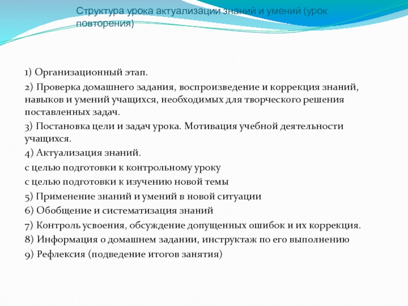 Структура урока актуализации знаний и умений (урок повторения) 1) Организационный этап.2) Проверка домашнего задания, воспроизведение и коррекция