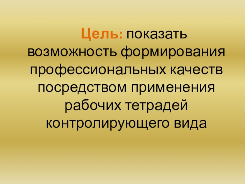 Слайд 2 Цель: показать возможность формирования профессиональных качеств посредством применения рабочих тетрадей контролирующего