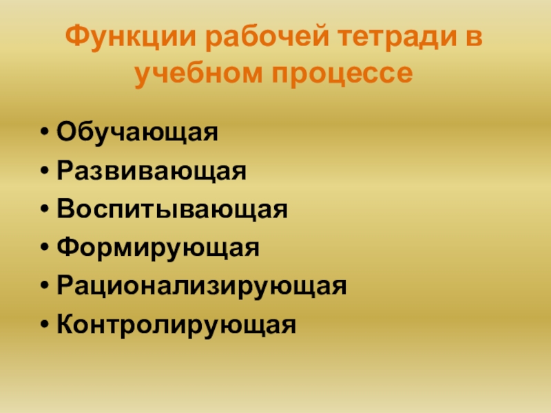 Функции рабочей тетради в учебном процессе ОбучающаяРазвивающаяВоспитывающаяФормирующаяРационализирующаяКонтролирующая