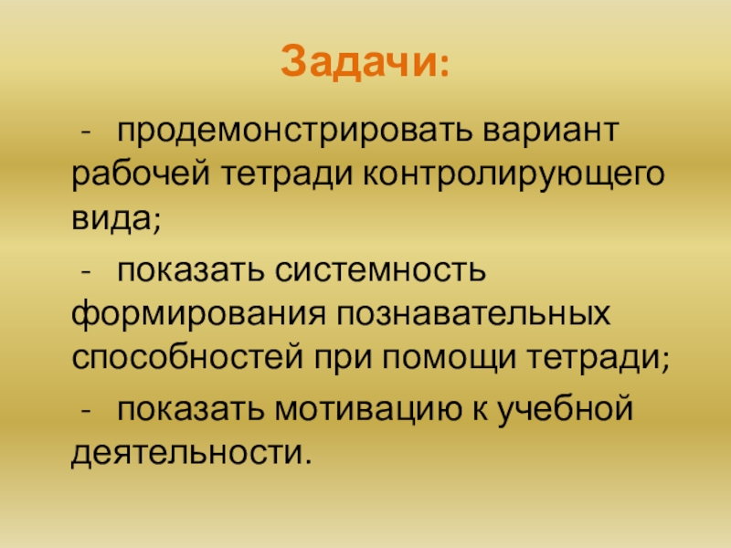 Задачи:	-	продемонстрировать вариант рабочей тетради контролирующего вида;	- 	показать системность формирования познавательных способностей при помощи тетради;	- 	показать мотивацию к