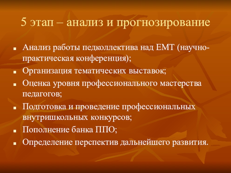 5 этап – анализ и прогнозированиеАнализ работы педколлектива над ЕМТ (научно-практическая конференция);Организация тематических выставок;Оценка уровня профессионального мастерства