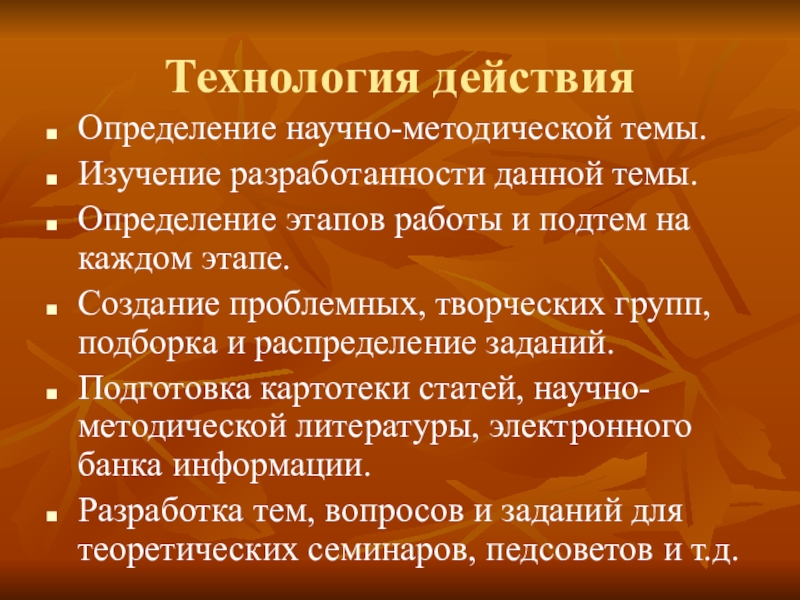 Технология действияОпределение научно-методической темы.Изучение разработанности данной темы.Определение этапов работы и подтем на каждом этапе.Создание проблемных, творческих групп,