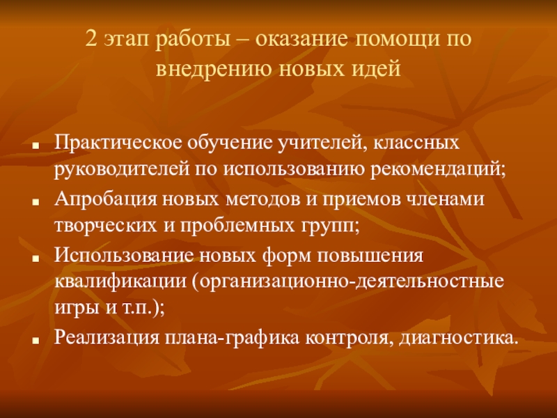 Слайд 102 этап работы – оказание помощи по внедрению новых идей
