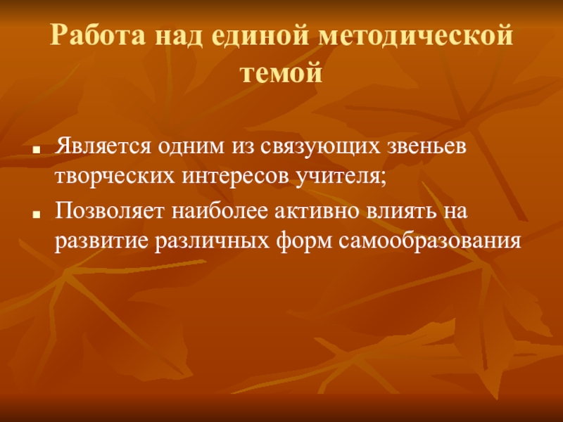 Работа над единой методической темойЯвляется одним из связующих звеньев творческих интересов учителя;Позволяет наиболее активно влиять на развитие