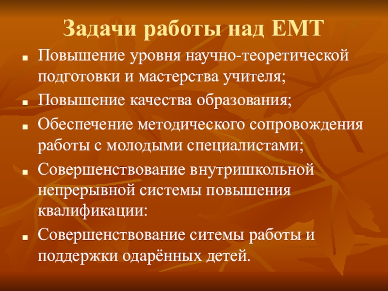 Задачи работы над ЕМТПовышение уровня научно-теоретической подготовки и мастерства учителя;Повышение качества образования;Обеспечение методического сопровождения работы с молодыми