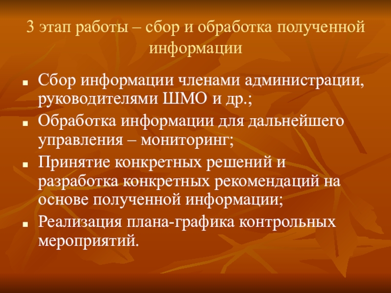 3 этап работы – сбор и обработка полученной информацииСбор информации членами администрации, руководителями ШМО и др.;Обработка информации