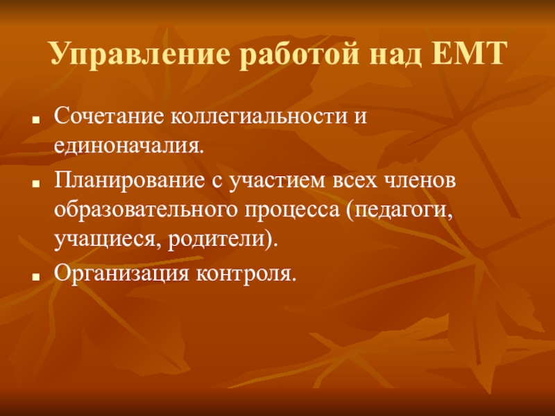 Управление работой над ЕМТСочетание коллегиальности и единоначалия.Планирование с участием всех членов образовательного процесса (педагоги, учащиеся, родители).Организация контроля.