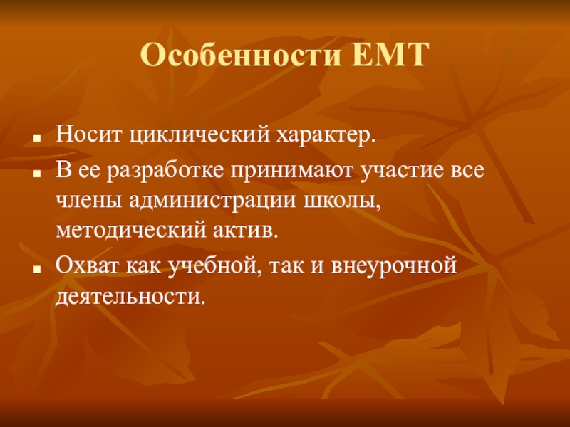 Особенности ЕМТНосит циклический характер.В ее разработке принимают участие все члены администрации школы, методический актив.Охват как учебной, так