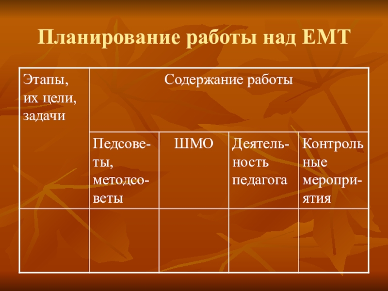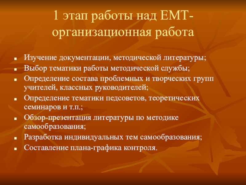 1 этап работы над ЕМТ- организационная работаИзучение документации, методической литературы;Выбор тематики работы методической службы;Определение состава проблемных и