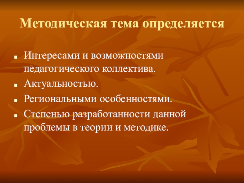 Методическая тема определяетсяИнтересами и возможностями педагогического коллектива.Актуальностью.Региональными особенностями.Степенью разработанности данной проблемы в теории и методике.