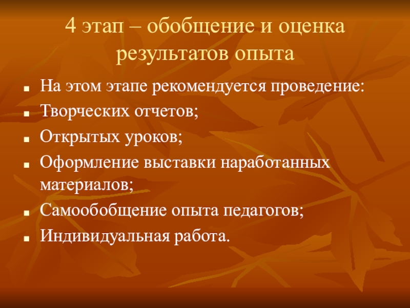 4 этап – обобщение и оценка результатов опытаНа этом этапе рекомендуется проведение:Творческих отчетов;Открытых уроков;Оформление выставки наработанных материалов;Самообобщение