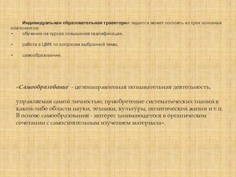 управляемая самой личностью; приобретение систематических знаний в какой-либо области науки, техники, культуры, политической жизни и т.п. В основе самообразования - интерес занимающегося в органическом сочетании с самостоятельным изучением материала».