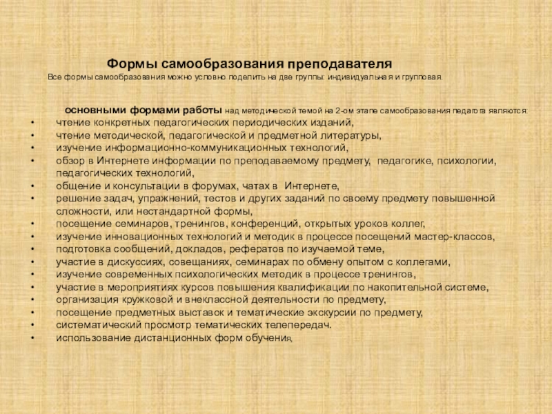 основными формами работы над методической темой на 2-ом этапе самообразования педагога являются: