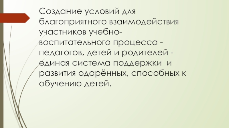 Слайд 30Создание условий для благоприятного взаимодействия участников учебно- воспитательного процесса - педагогов,