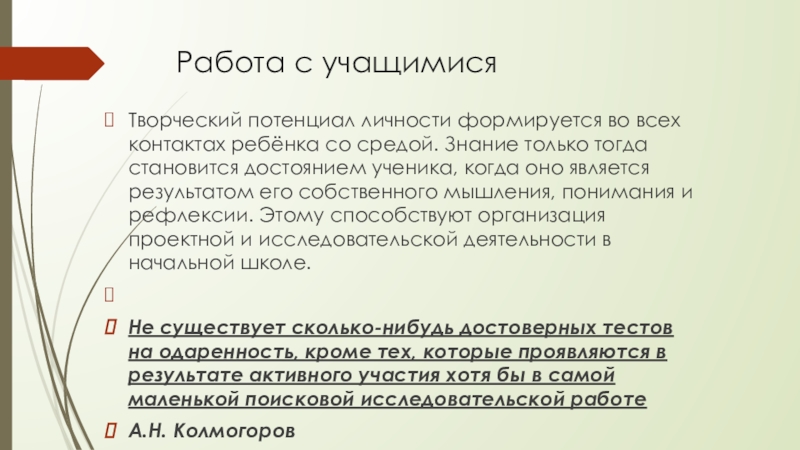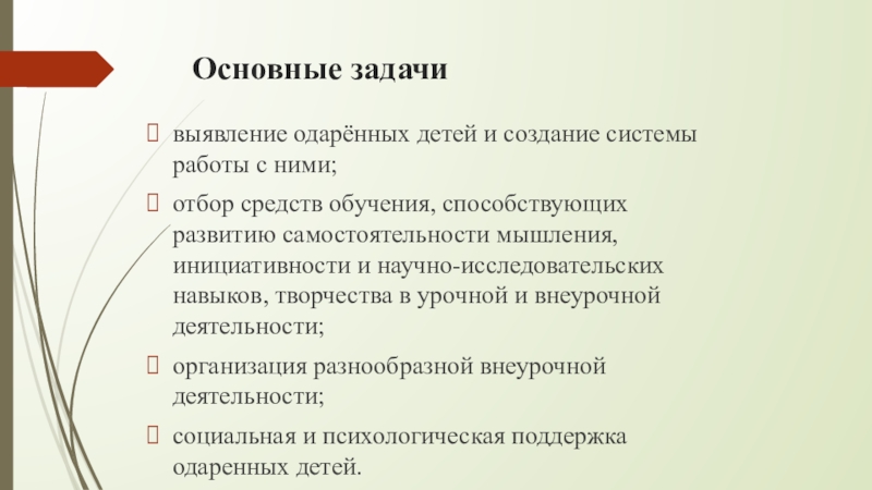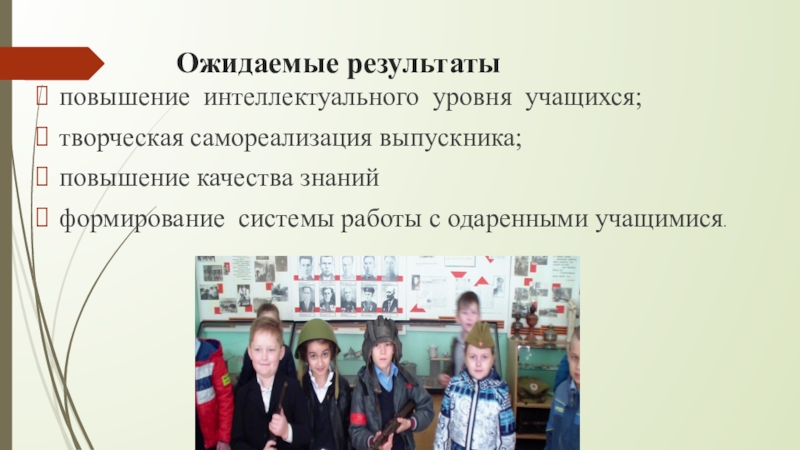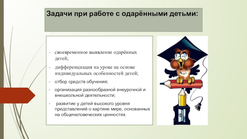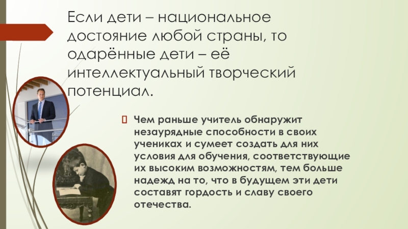 Чем раньше учитель обнаружит незаурядные способности в своих учениках и сумеет создать для них условия для обучения, соответствующие их высоким возможностям, тем больше надежд на то, что в будущем эти дети составят гордость и славу своего отечества.